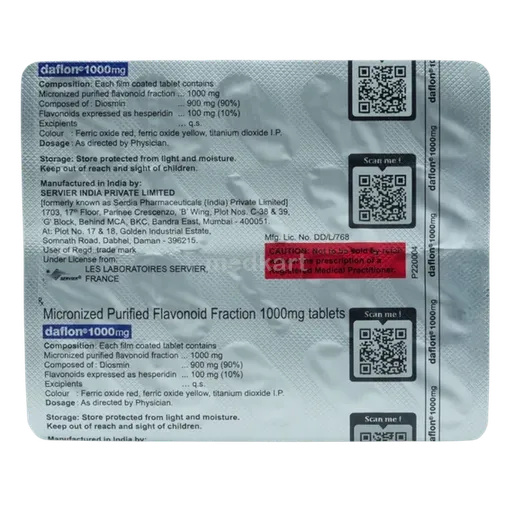 Daflon 1000mg टैबलेट नसों में रक्त प्रवाह को बढ़ाकर और केशिकाओं की दीवारों को मजबूत करके काम करती है। यह सूजन को कम करने और समग्र संवहनी स्वास्थ्य में सुधार करने में मदद करता है।