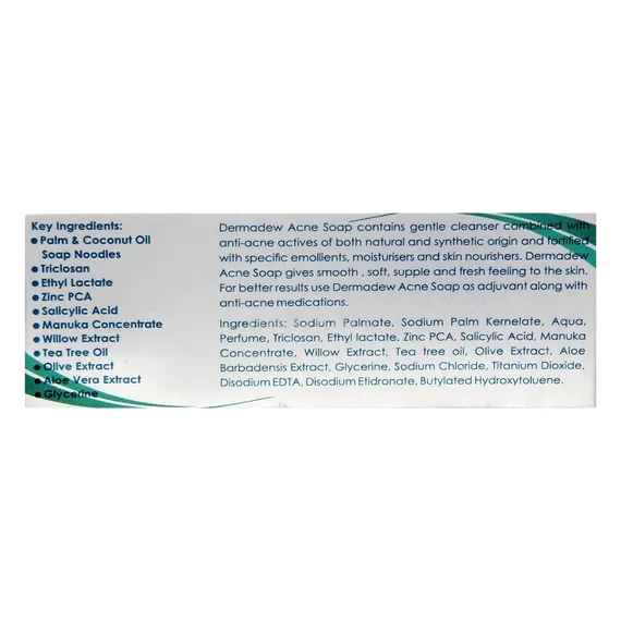 डर्माड्यू एक्ने सोप 75 जीएम में मुख्य सामग्री एलोवेरा, टी ट्री ऑयल, और सैलिसिलिक एसिड शामिल हैं, जो त्वचा को स्वस्थ रखने में मदद करते हैं।