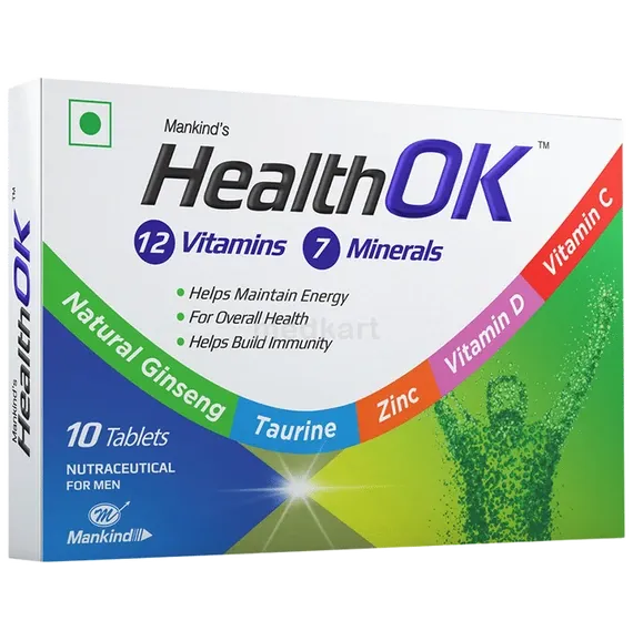 हेल्थ ओके टैबलेट में विटामिन सी, विटामिन डी3, विटामिन बी12, जिंक, और अन्य आवश्यक विटामिन और खनिज शामिल हैं।