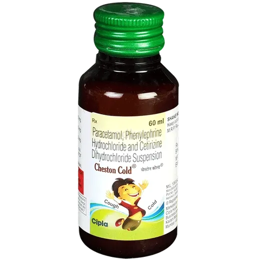 Cheston Cold Syrup 60 ml typically contains an antihistamine (such as Chlorpheniramine), a decongestant (such as Phenylephrine), and a cough suppressant (such as Dextromethorphan).