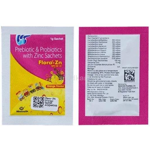Flora ZN Sachet 1 GM is a combination of probiotic and zinc, used to improve gut health and help manage diarrhea.