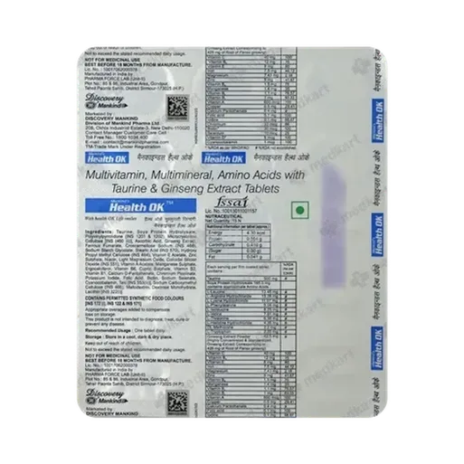 Health OK Tablet typically contains Vitamin A, Vitamin C, Vitamin D, Vitamin E, B-complex vitamins, Zinc, Iron, Calcium, and other essential minerals.