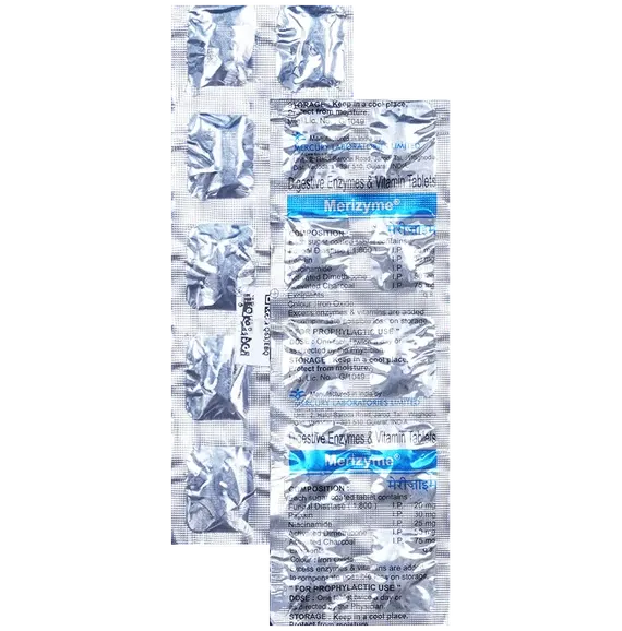Merizyme Tablet is a digestive enzyme that helps relieve indigestion, bloating, and other stomach problems. It aids in the digestion of food.