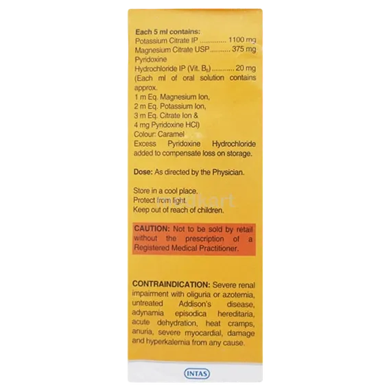 It typically contains potassium citrate, magnesium citrate, and pyridoxine (Vitamin B6).