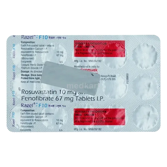 RAZEL F 10MG TABLET 15'S contains Rosuvastatin and Fenofibrate as active ingredients.