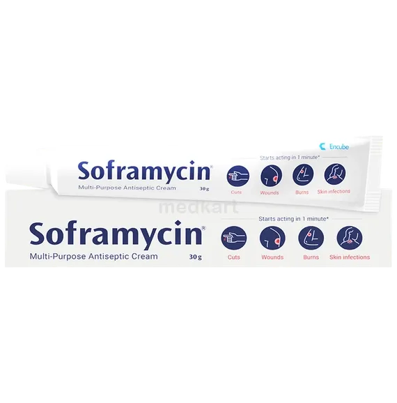 Be careful not to get SOFRAMYCIN SKIN CREAM 30 GM into your eyes or mouth. If you happen to get it in your eyes, rinse off with plenty of water and contact your doctor. You must not use SOFRAMYCIN SKIN CREAM 30 GM if you are allergic to it or any of its ingredients. Tell your doctor if you notice any allergic reaction while using it for the first time. Inform your doctor if you are taking any medicines regularly to prevent any allergic reaction with other medicines. Do not cover the area being treated with SOFRAMYCIN SKIN CREAM 30 GM with a bandage, as this may increase absorption of this medicine and increase the side effects. Do not use more than what is recommended to relieve your symptoms faster. Using more than what is advised will only increase the side effects. Let your doctor know if you are planning to conceive. Pregnant and breastfeeding mothers should use SOFRAMYCIN SKIN CREAM 30 GM only if prescribed by the doctor.