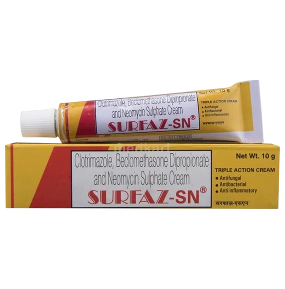 Like all medicines, SURFAZ SN CREAM 10 GM can cause side effects, although not everybody gets them. **Common Side Effects:** * Itching, burning, or irritation at the application site * Dryness or peeling of the skin * Redness or rash * Allergic reactions (contact dermatitis) **Uncommon Side Effects:** * Thinning of the skin * Changes in skin color * Increased hair growth * Acne or folliculitis * Secondary skin infections * Stretch marks * Systemic absorption (rare, but possible with prolonged use or application to large areas, leading to adrenal suppression or Cushing's syndrome)