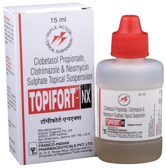 Like all medicines, TOPIFORT NX TOPICAL SUSPENSION 15 ML can cause side effects, although not everybody gets them. **Common side effects (may affect up to 1 in 10 people):** * Application site reactions (itching, burning, redness, irritation) * Dry skin * Acne **Uncommon side effects (may affect up to 1 in 100 people):** * Allergic contact dermatitis * Skin atrophy (thinning of the skin) * Telangiectasia (spider veins) * Striae (stretch marks) * Hypertrichosis (excessive hair growth) * Hypopigmentation (loss of skin color) * Secondary infection * Folliculitis (inflammation of hair follicles) **Rare side effects (may affect up to 1 in 1,000 people):** * Systemic effects due to absorption of the corticosteroid, such as adrenal suppression (especially with prolonged use or application to large areas). **Very rare side effects (may affect up to 1 in 10,000 people):** * Increased intraocular pressure (glaucoma) or cataracts (with prolonged use near the eyes).