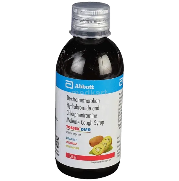 Possible side effects of TOSSEX DMR SYRUP 100 ML may include: * Drowsiness * Dizziness * Headache * Nausea * Vomiting * Constipation * Dry mouth * Blurred vision * Difficulty concentrating * Confusion * Restlessness * Tremors * Increased heart rate * Skin rash or itching * Difficulty breathing * Seizures (rare) * Hallucinations (rare) * Urinary retention