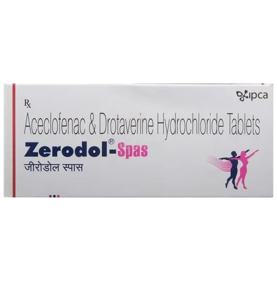 Zerodol Spas Tablet contains two active ingredients: Aceclofenac, which is a non-steroidal anti-inflammatory drug (NSAID) that reduces pain and inflammation, and Drotaverine, an antispasmodic agent that relaxes smooth muscles to relieve spasms.