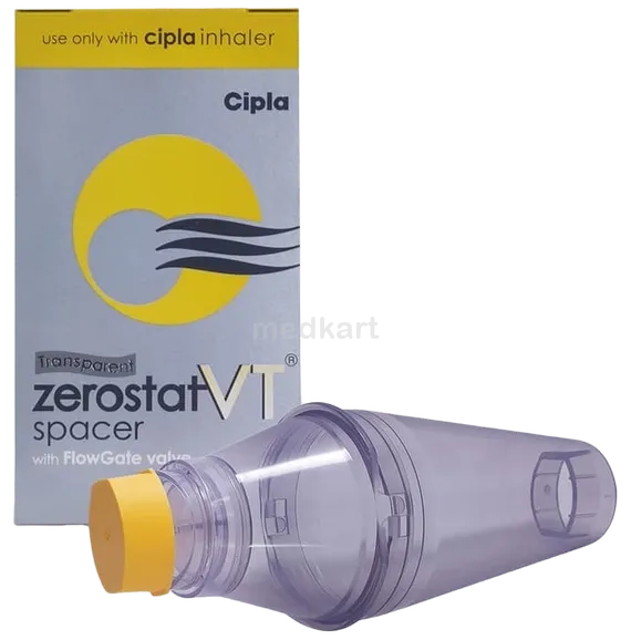 ZEROSTAT VT SPACER is a valved holding chamber designed to be used with Metered Dose Inhalers (MDIs). Its primary use is to improve the delivery of inhaled medication to the lungs, making MDI use more effective, especially for patients who have difficulty coordinating their breathing with the MDI actuation.